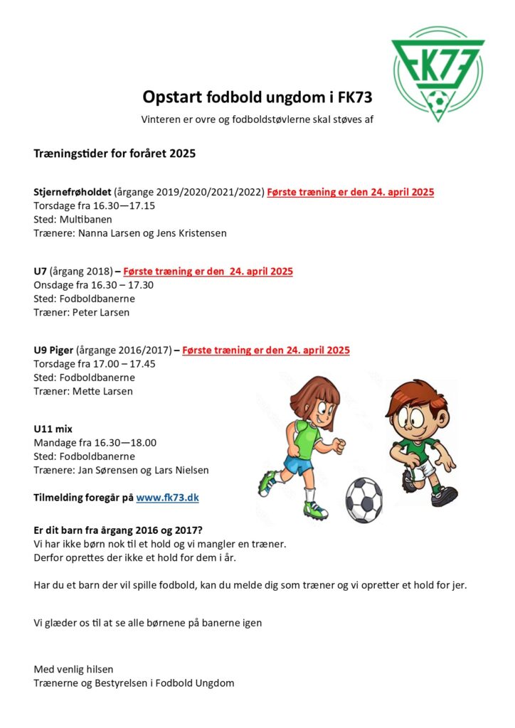 OBS! U7 har rykket første træning til torsdag, men fremad rettet træner de om onsdagen! By Maja Ladefoged Märcher21. april 2025Fodbold ungdom, Ikke kategoriseret